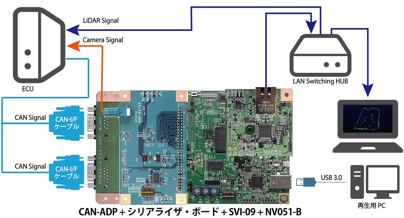 更に、LiDARを使用した自動運転システム開発向けのツールとして、マルチ I/F 録画再生システムを開発し、ホストPCに接続した SVI-09ボード + 拡張ボードでの、録画と再生を実現させました。