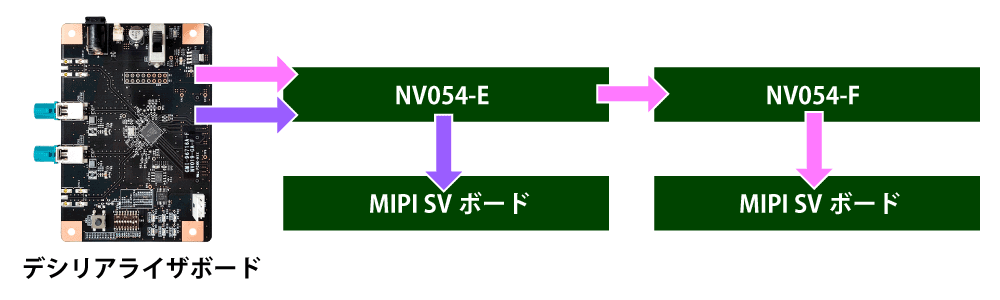 デシリアライザボードからのMIPI信号をNV054-E経由でMIPI SVボードに流しMIPI SVボード内で分岐させます。分岐させた信号の一方を再びNV054-Eへ戻し、NV054-F経由でもう一方のMIPI SVボードへ流し込みます。