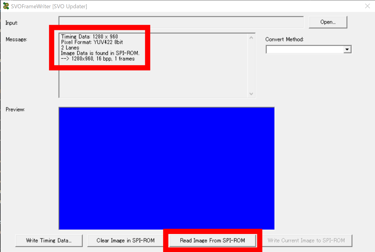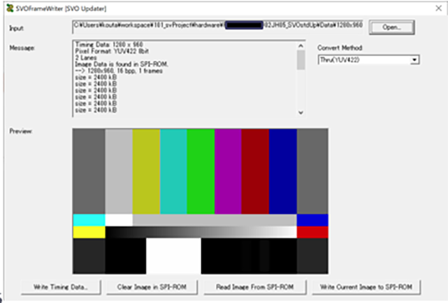 • Preview に選択した画像データが表示されるので、Open の下に存在する Convert Methodのリストから、Thru(YUV4:2:2)を選択、ウィンドウ右下のWrite Current Image to SPI-ROM をクリックします。