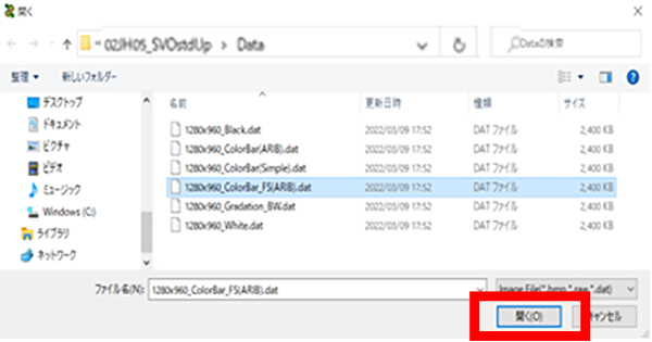 • 画像データ選択ウィンドウが立ち上がるので、設定ファイル、1280x960_ColorBar_FS(ARIB).dat を選択し開くをクリックします。