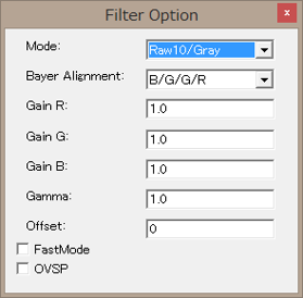 - NVCap で NVRawDLL を有効にすると、下図のような Filter Option ダイアログが表示されます。このダイアログの設定内容によってフィルタの機能や映像の調整を行います。