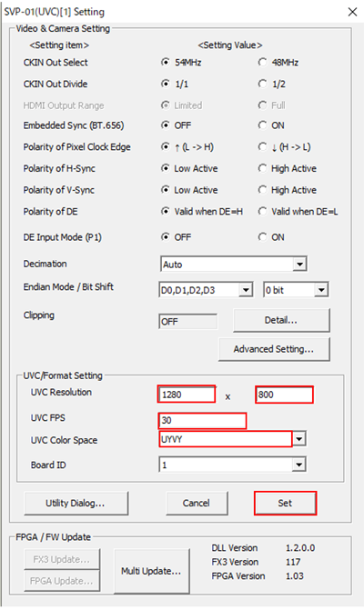 送信側で設定した画像サイズ:1280×800、フレームレート:30fps、UVC Color Space:UYVYを入力・選択し、Setを選択します。