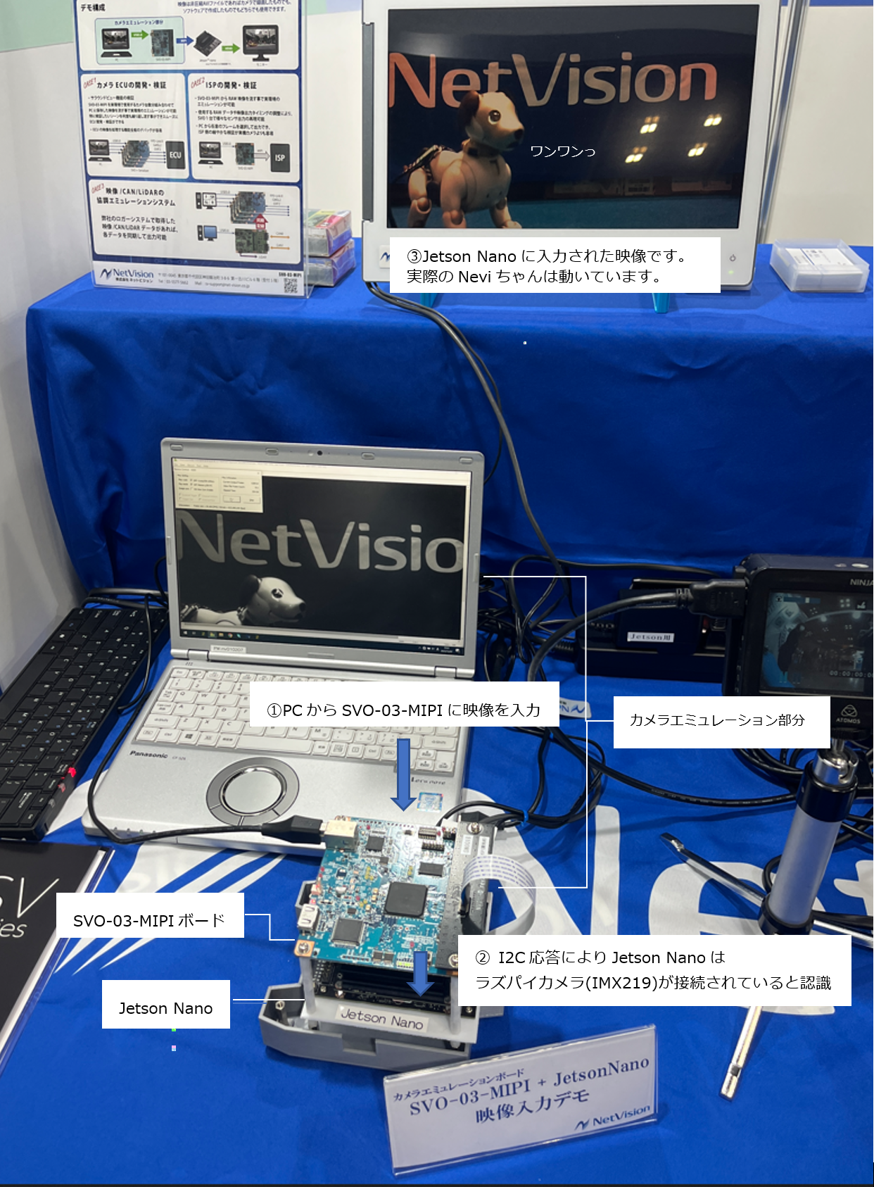 SVO-03-MIPIボードを使用して、PCに保存された映像をJetson Nanoへ入力し、その映像をJetson Nanoに接続されたモニタに出画させました。