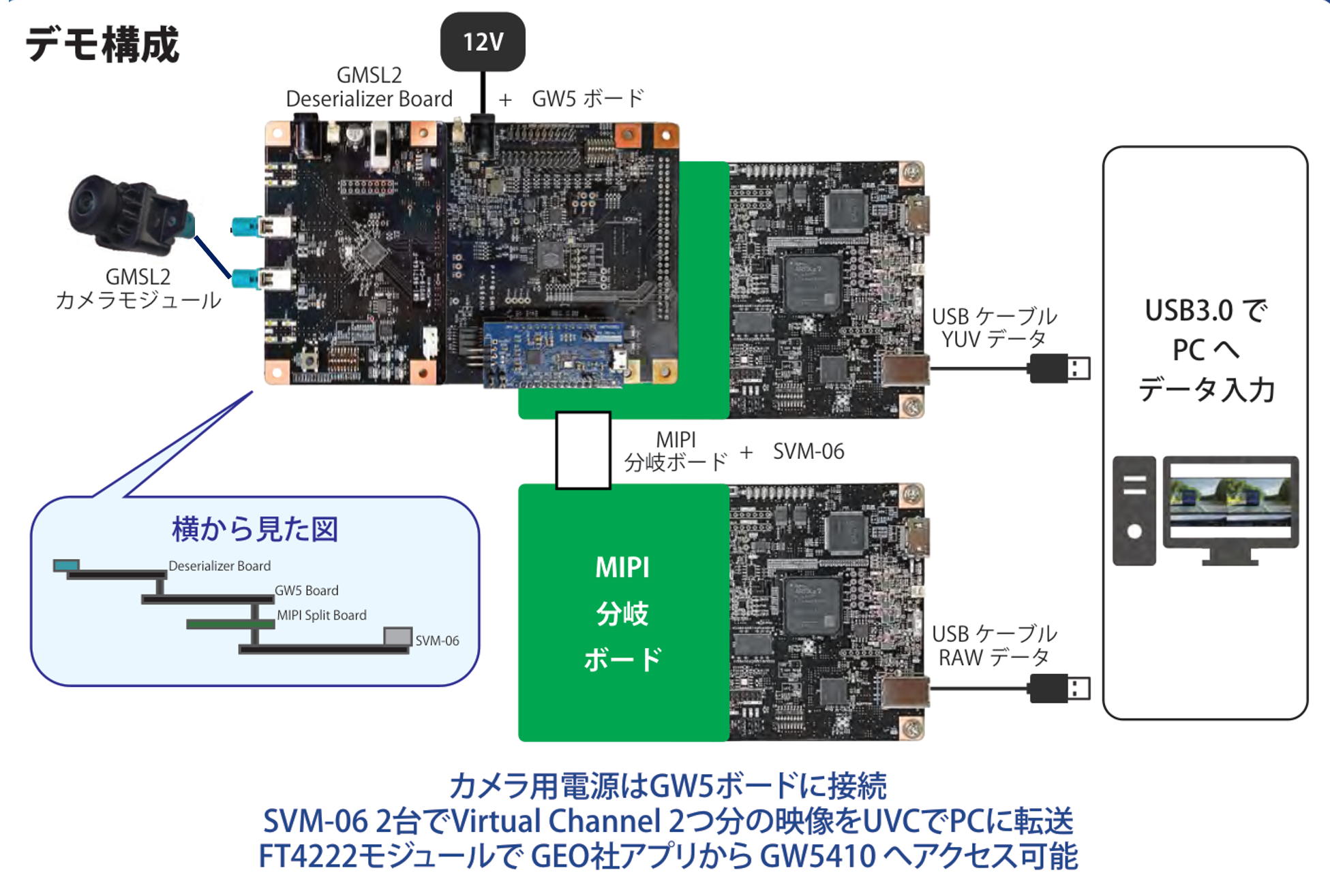 ボードの構成は、GW5ボード 1枚、Deserializer Board GMI-96716A-Fボード 1枚、MIPIキャプチャーボードSVM-06 2枚、MIPI分岐ボード(NV054-C、NV054-D)2枚の計6枚です。