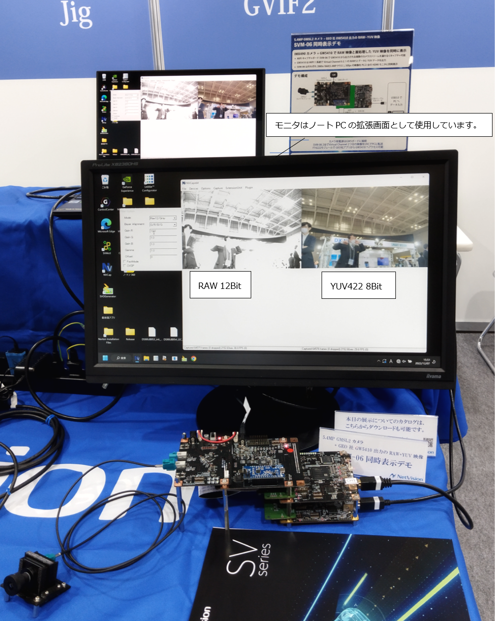 GMSLのカメラの映像をGMI-96706-Fボード+SVP-01-Uボードで取込み、HDMIスプリッタを使いHDMIモニタとNINJA2の2つに表示させました。PCを使わずにカメラの映像をモニタに表示させることができます。