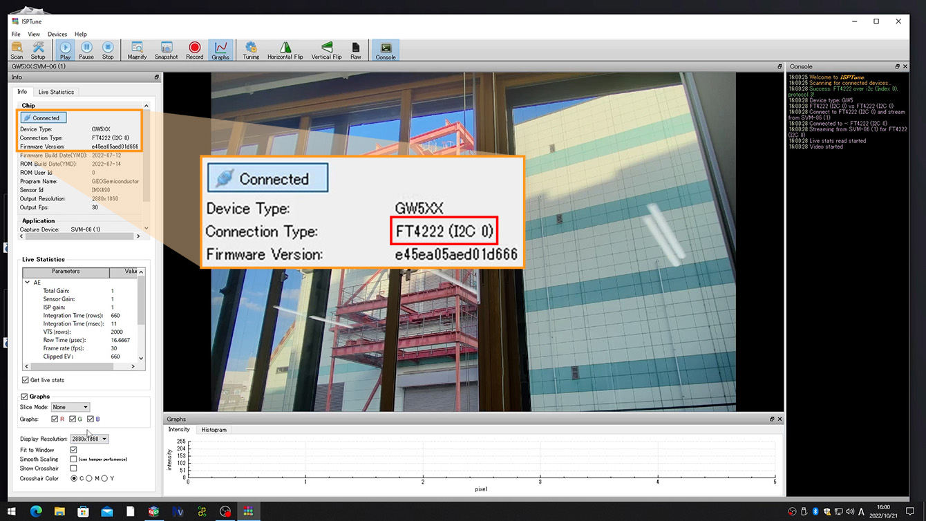 GW5ボードのISP制御インタフェースは、GEO社製評価ボードと互換性があるため、GEO社純正ツールでISPの設定や制御・FWのアップデートが可能です。
