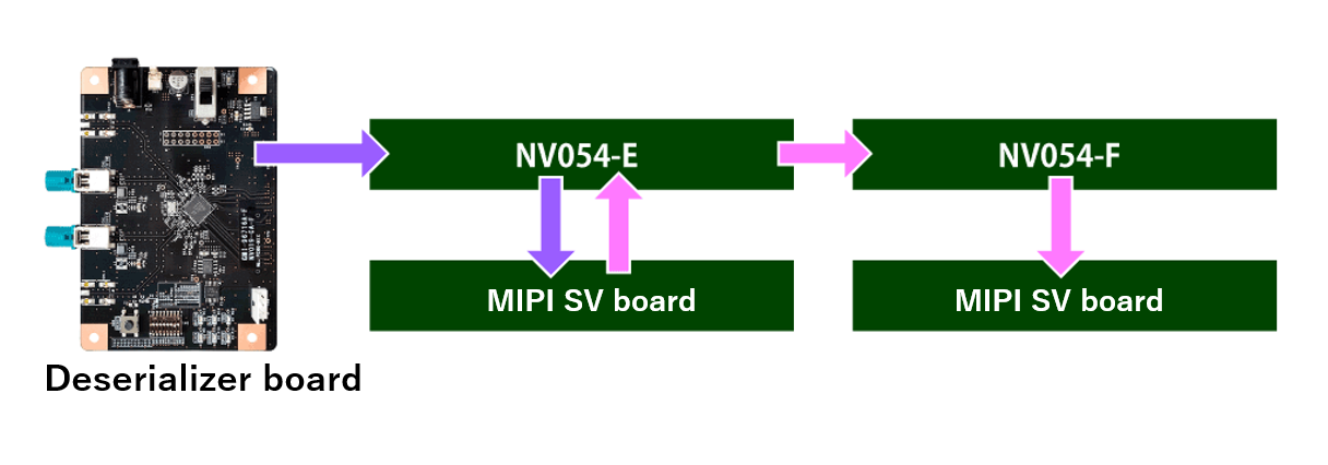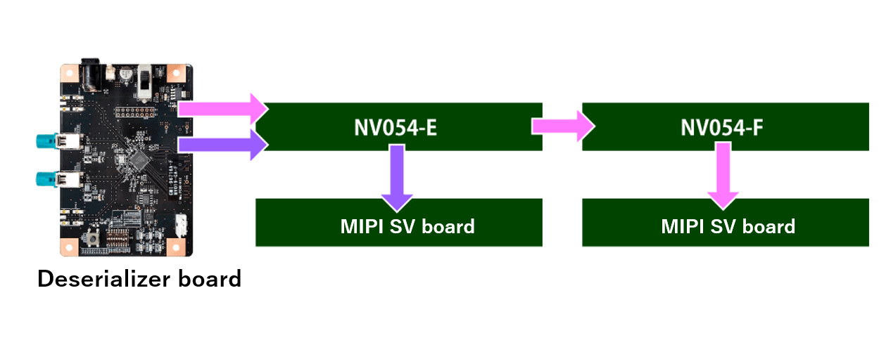 The MIPI signal is split by utilizing the dual‑channel MIPI output function of the deserializer board. A deserializer board equipped with dual‑channel output sends two MIPI channels to the NV054‑E.