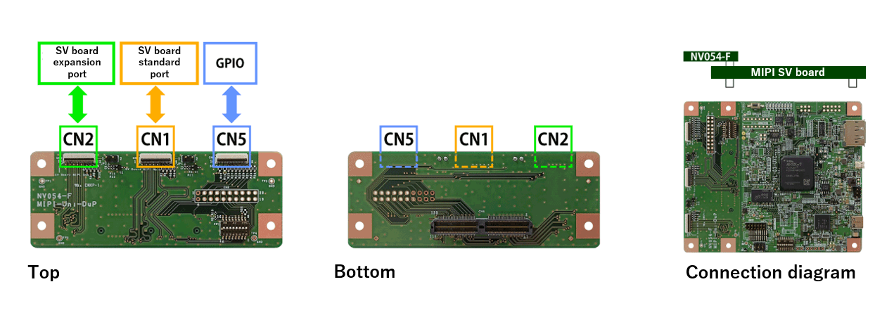 The NV054-F is a board for inputting and outputting MIPI CSI-2 video signals via an FFC connector.