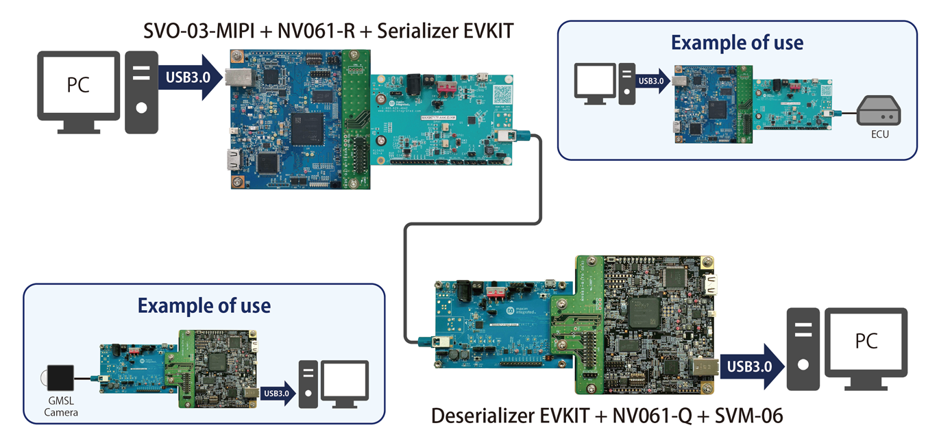 メーカー製評価キットと接続するための接続ボードをメーカー様もしくは弊社で準備しております。これらの接続ボードは、SVM-06 及びSVO-03-MIPI、SVO-06 で使用できます。弊社で準備しているボードの販売価格は、30,000 円(消費税別)となります。
