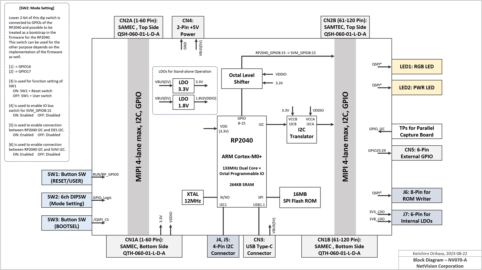 本マイコンボードはRaspberry Pi Foundation RP2040マイコンを搭載し、MIPI-SVシリーズボード及びSerDesボードに対して、様々な機能を付加することを目的に開発されました。本基板に同梱されるMicro Pythonで記述されたスクリプト群を活用することで、様々な機能の実現が可能となります。