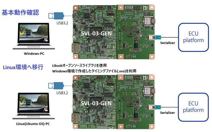 非圧縮のAVI映像を、Linux(Ubuntu OS)環境からジェネレータボードに送ることができます。映像出力タイミングの設定は、Windows環境で作成したタイミングファイル(.svo)を流用します。これによりLinux(Ubuntu OS)環境から、映像をMIPI信号として機器に出力できます。