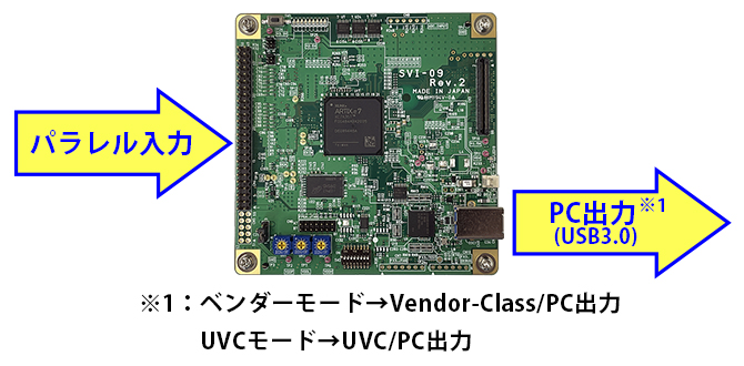 パラレルイメージレコーダーSVI-09は、パラレルインタフェースの映像信号を、USB3.0(Vendor Class/PC)と入出力するためのボードです。