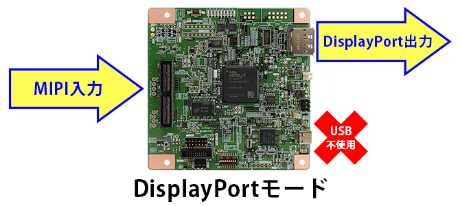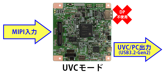 SVL-03-UVCは、MIPI CSI-2映像信号を録画・表示するためのボードです。入力した映像は、DisplayPortモニターとUSB3.2-Gen2に出力できます。