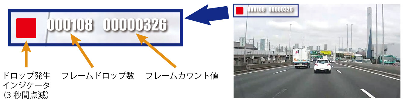 フレームカウンタの値がわかればそれを映像情報の例えば左上にOSD(オンスクリーン表示)の機能を使って表示することが可能です。例えばフレームドロップを検知した場合、映像上に「3秒間」インジケータを点滅して表示することにより検査する人が視覚的にエラーを発見することが可能となります。 またフレームのドロップした数を数値として表示することも可能です。