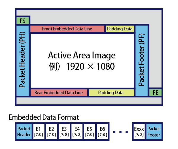 一般的に映像の先頭部分に何ラインかのEmbedded Dataがあり、映像の最後にも何ラインかのEmbedded Dataが付加されています。