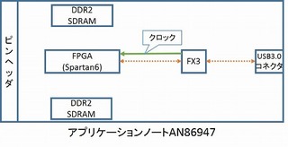 一方、アプリケーションノートでのデータの流れは左図となります。このアプリケーションノートの検証の場合は、弊社検証ではFPGAが行っていたフロー制御を行なっていません。