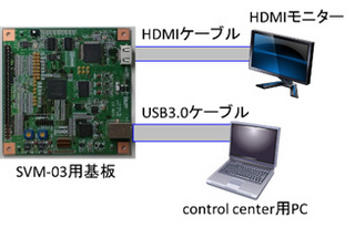 このように設定して、USBケーブルでPCとボードを接続すると、HDMIモニターにカラーバーが表示されます。