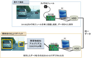 ただし、これを行うにはカメラを実際に自動車に搭載してリアルタイムでアルゴリズムを検証する必要があります。開発者の人も毎回自動車に乗っての試験を繰り返す必要が出てきます。それではさすがに効率が悪いですね!! そこで、イメージセンサ信号発生ボードSVO-02の出番というわけです