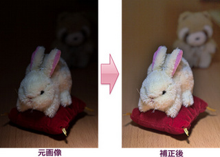 たとえば左図(シンセシス様のサイトから転載)のように暗いところにあるぬいぐるみが、補正をかけるとよく見えるようになったりします。