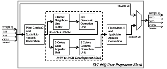 前処理ブロックの枠組みでRAW現像IPとして”RAW to RGB Development Block”(RAW現像ブロック)を組み込んでいます。